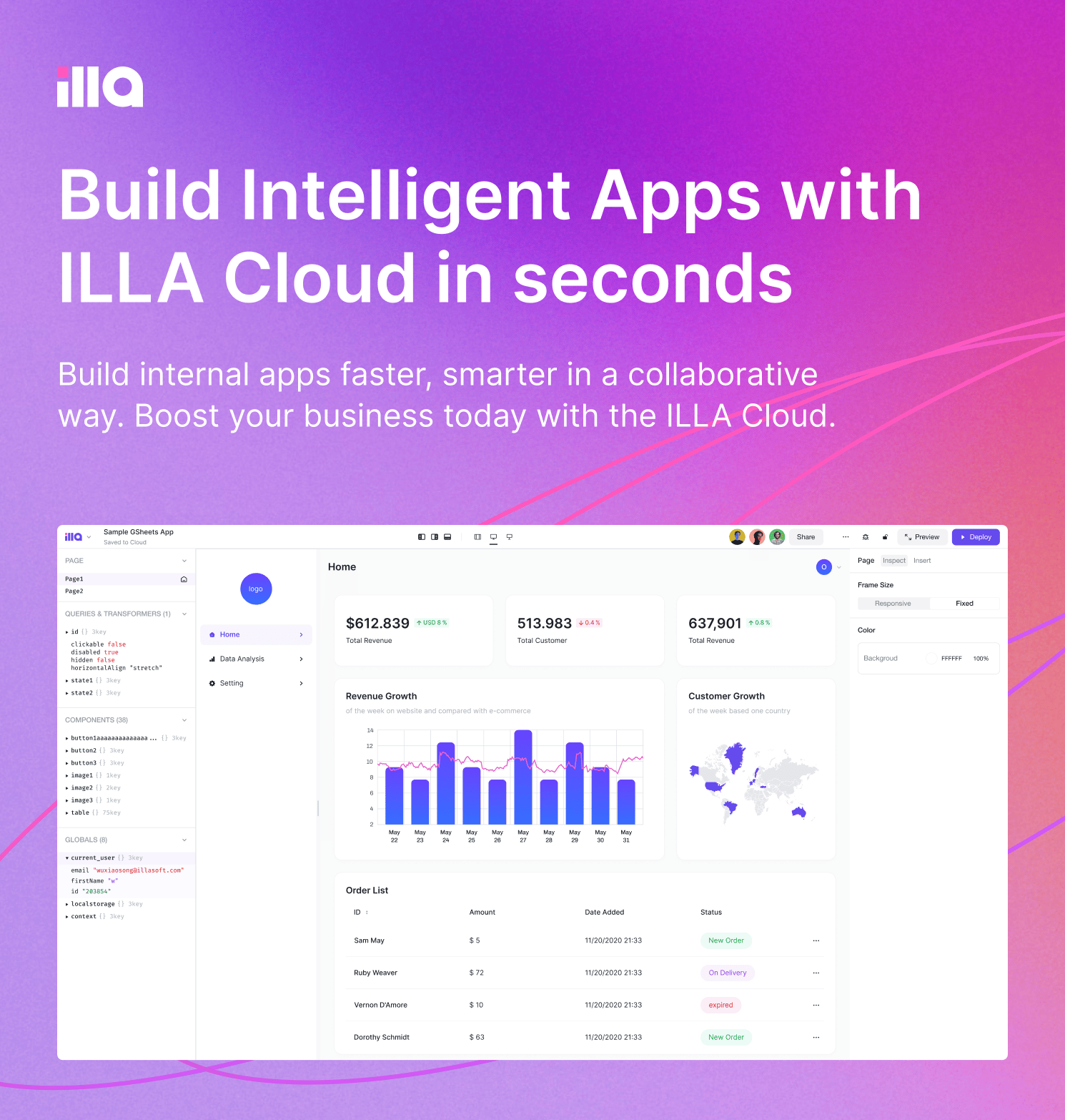 Create your own dashboards or apps for internal use with ILLA Cloud, the open-source and free platform that lets you build and deploy in minutes. No coding required, no hidden fees, no hassle.